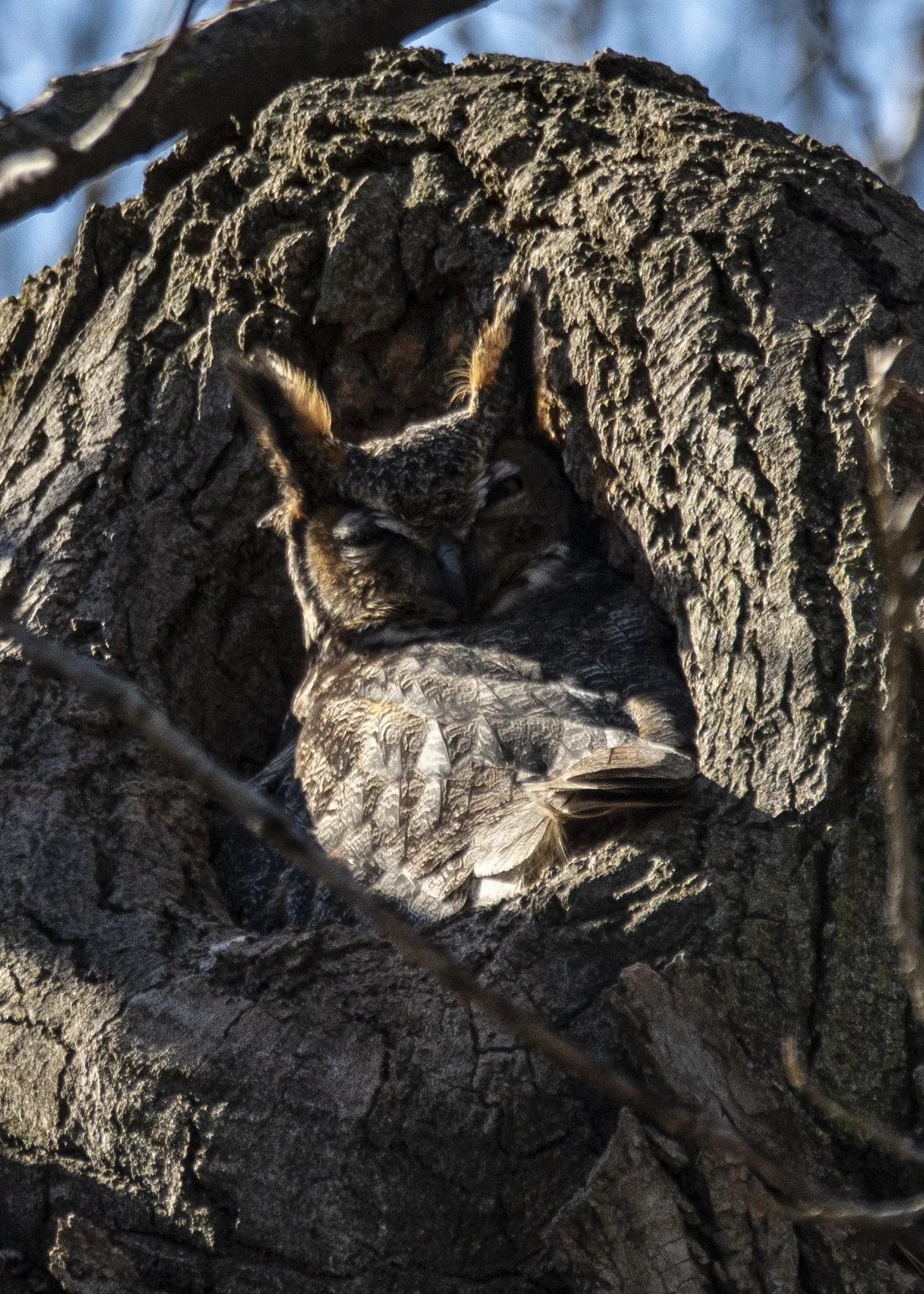 With Dixie back home gnawing on a snack, I jumped on my bike and started heading for work. On the way, I thought I’d check in on Astrid, the female great-horned owl who lives near Kingshighway. She has been sitting on a nest in the same crevice of an old cottonwood tree she used last year.