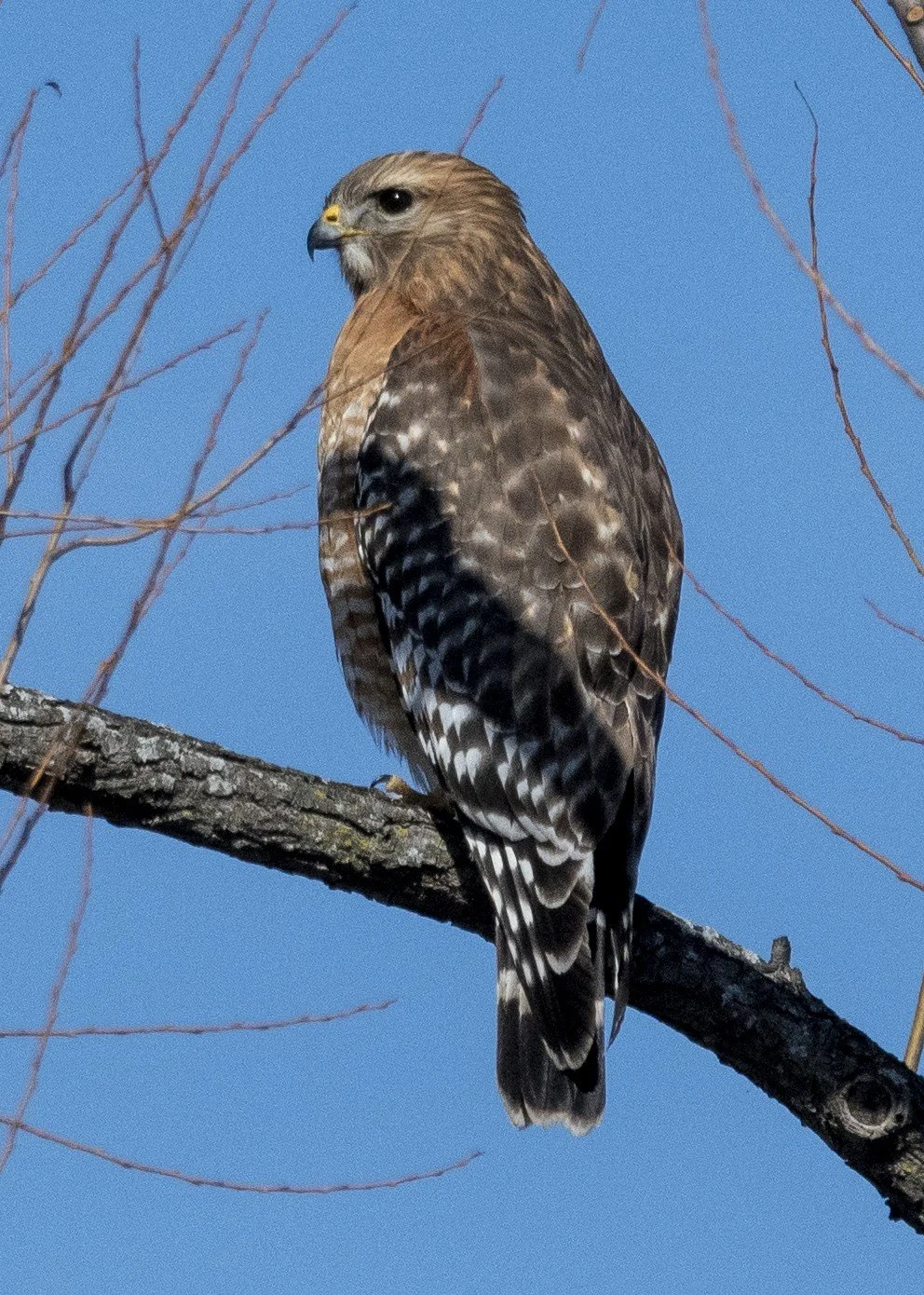 Jumped on my bike, over the bridge to the bike trail, and wallop, there was a red shouldered hawk staring at me.