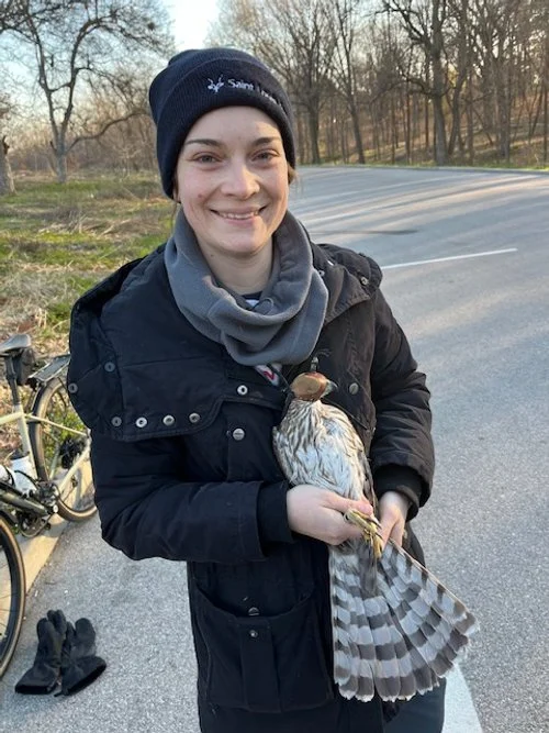 Topaz isn’t the only Forest Park raptor that has been affected by vehicle collisions. In 2023, “Lynyrd”, another Red-tailed Hawk, was first found on the ground near Forest Park unable to fly. He turned out to have several broken wing and tail feathers consistent with being hit by a car. Lynyrd’s feathers were repaired by expert wildlife rehabbers at the World Bird Sanctuary through a process called “imping”. We released him with a GPS tag in Forest Park just a few days later.