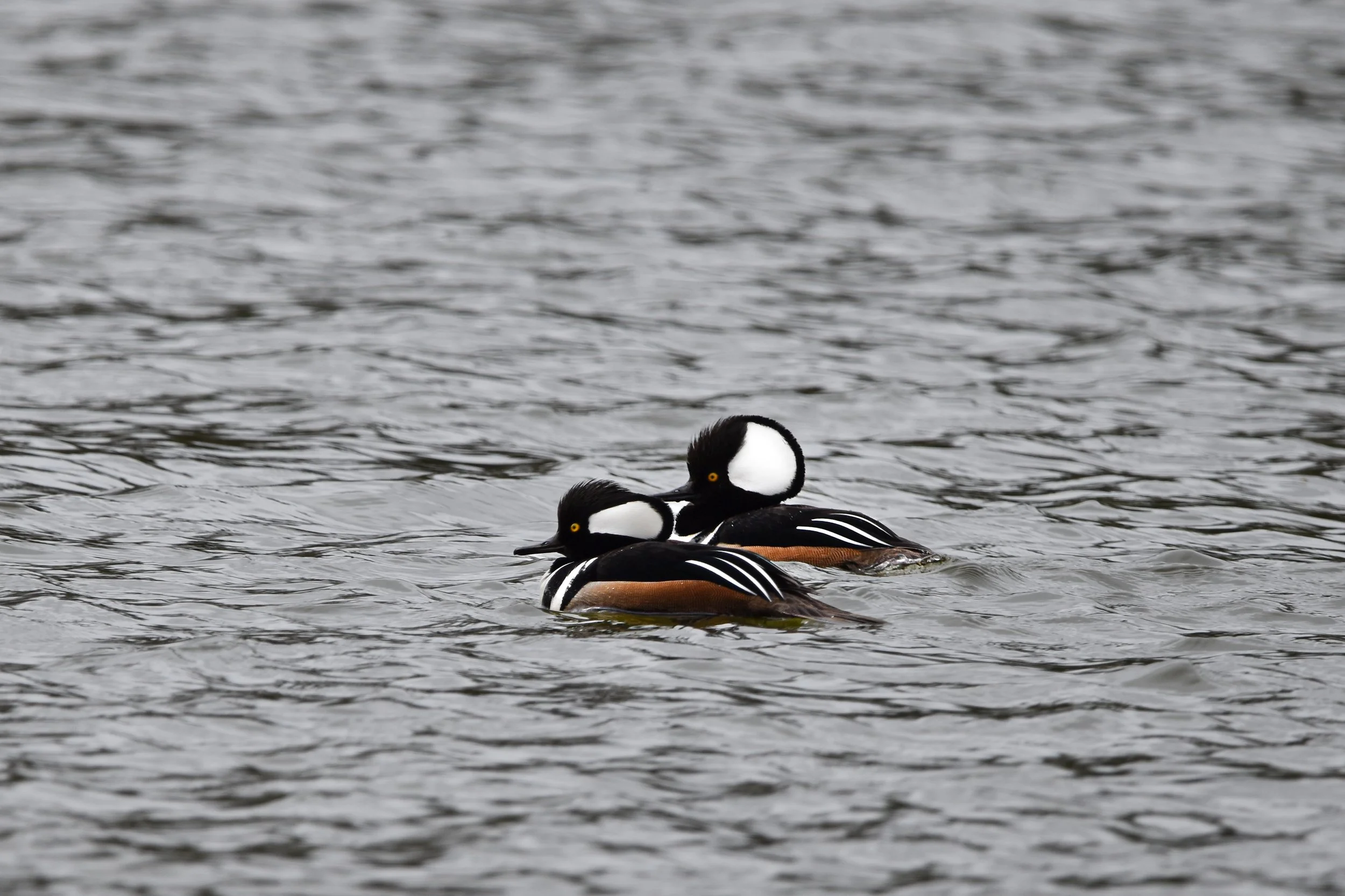 Two male hooded mergansers float in Post-Dispatch Lake, near the Boathouse. Hooded mergansers are a winter resident of the region and dive underwater to hunt for prey.
